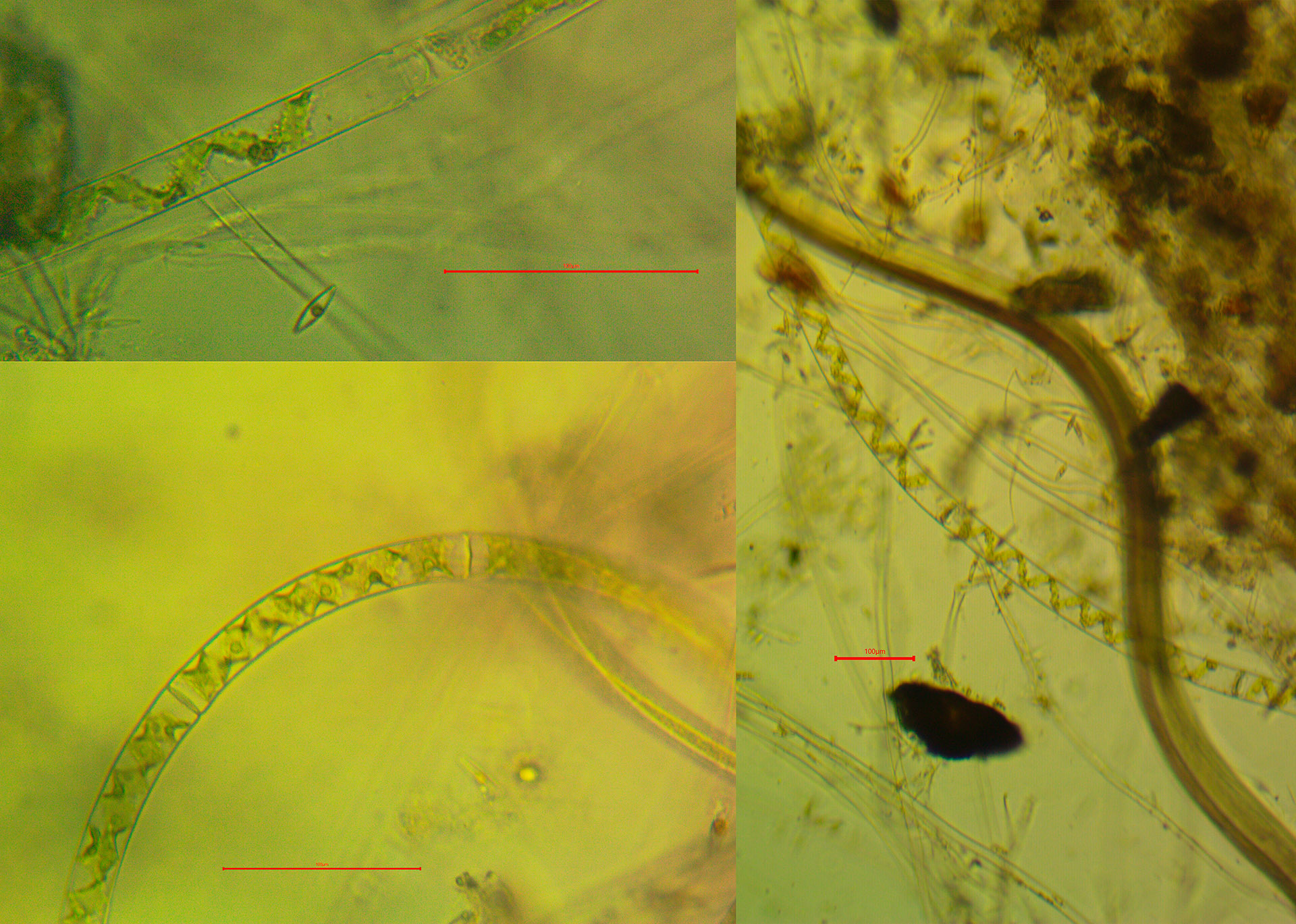 Рис. 2. Микрофотографии нитей спирогир (пока встречались единично) в пробах фитобентоса, собранных на м. Большой Солонцовый (западное побережье Северного Байкала. Ранее эти водоросли в данном районе обнаружены не были. Фото Юргина Р. Масштаб : 100 мкм.