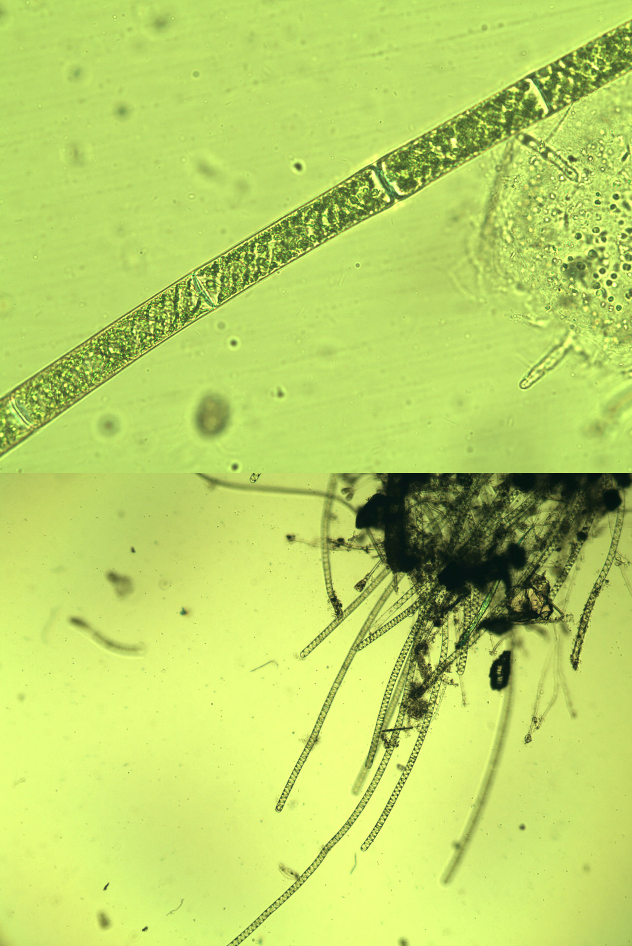 Рис. 4. Верхняя микрофотография - зрелая нить «фекального морфотипа» спирогиры, обнаруженная на гл. 1.5 м, на каменистом грунте; нижняя микрофотография – многочисленные нити 2-х морфотипов однохлоропластных спирогир, гл. 2 м, камни, песок; мыс Ижимей (восточное побережье о. Ольхон). Примерное увеличение: 400Х и 40Х, соответственно. Фото Тимошкина О.А.