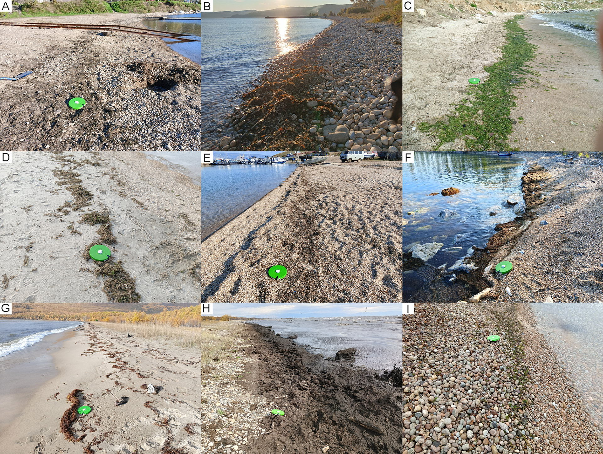 Рис. 5. Фотографии обнаруженных БСД на изученных станциях: A – напротив пос. Култук; B – напротив г. Бабушкин; C – бухта Ая; D – напротив пос. Сахюрта; E – напротив пос. Хужир; F – о. Большой Ушканий, бухта Северная; G – бухта Сеногда; H – напротив пос. Заречное; I – бухта Фролиха. Фото Алексеевой Т. и Кривороткина Р.